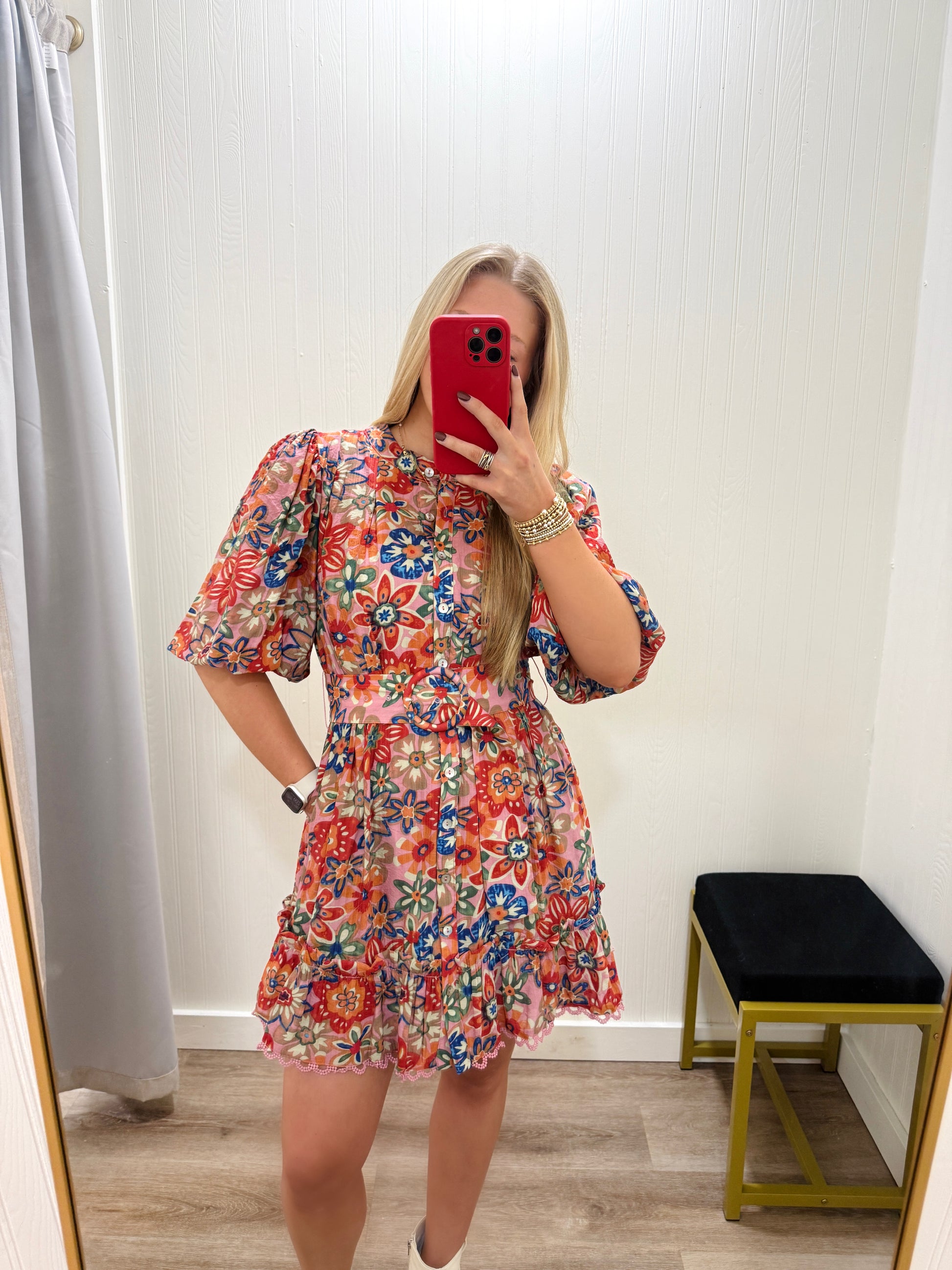 Mauve multi crochet dress with lace trimmed edges & puff sleeves with belt.