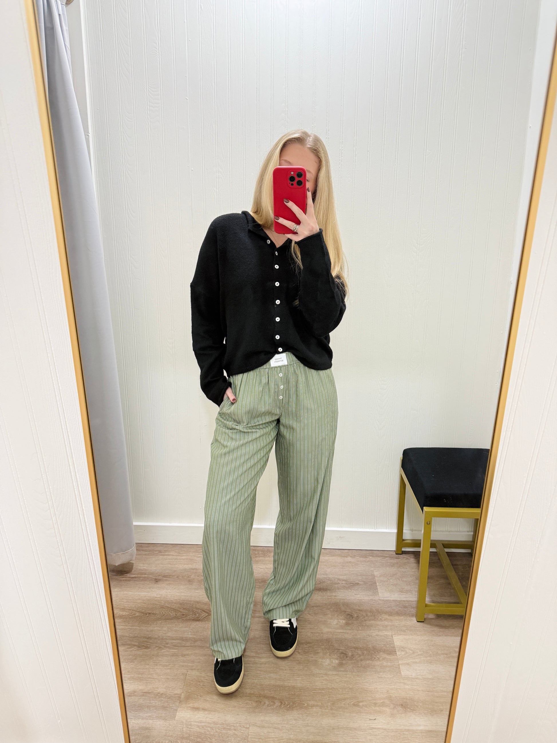 Olive green striped wide leg boxer pants with a comfortable waistband.