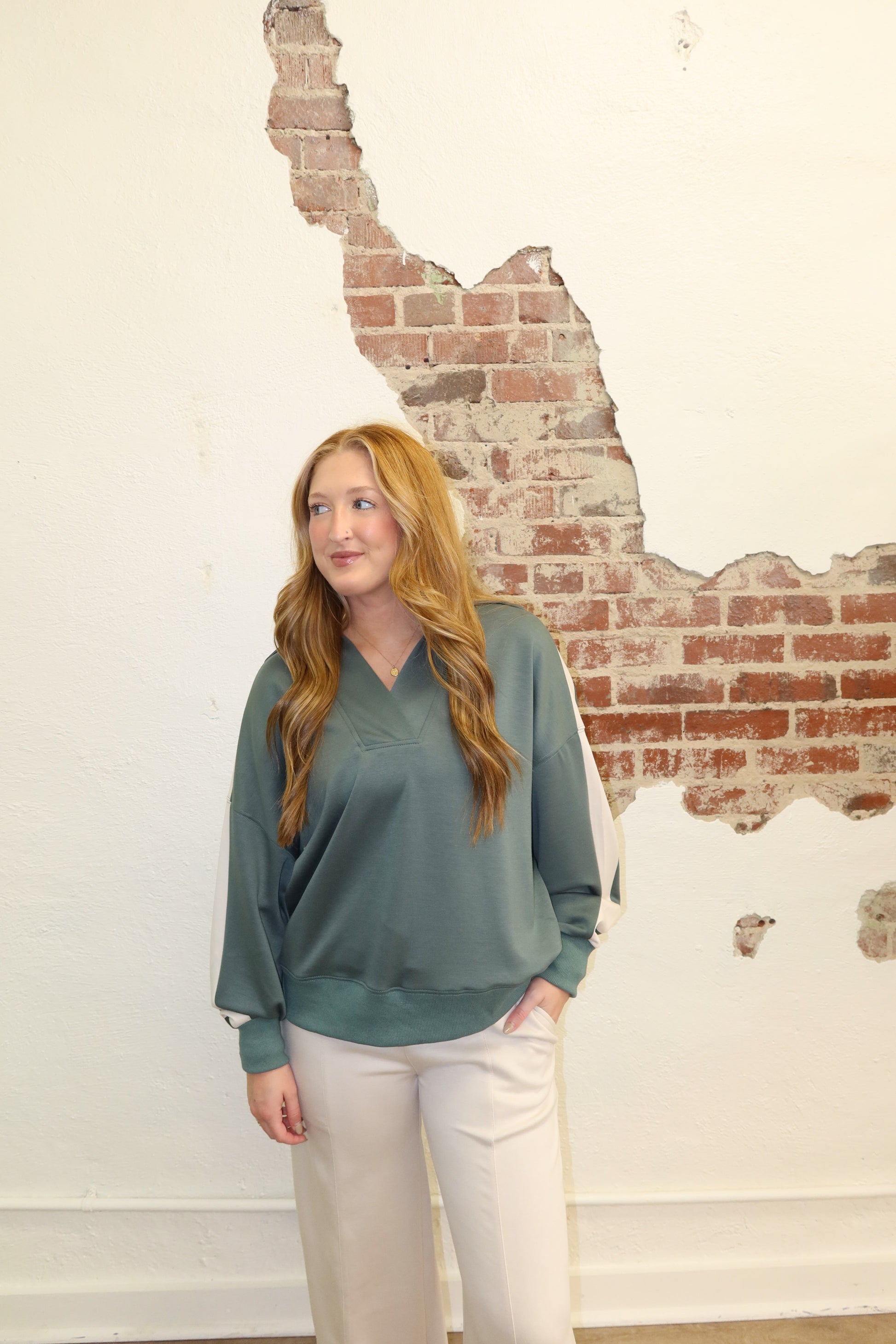 Lagoon luxe knit pullover with polo, colorblock detail & oversized fit.