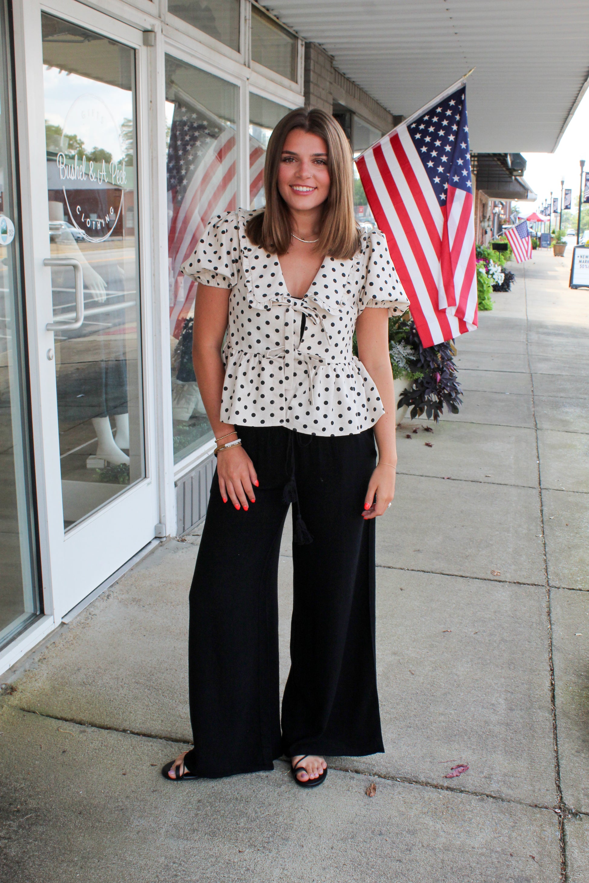 Oatmeal linen blouse top with black polka dot design & front bow tie detail.