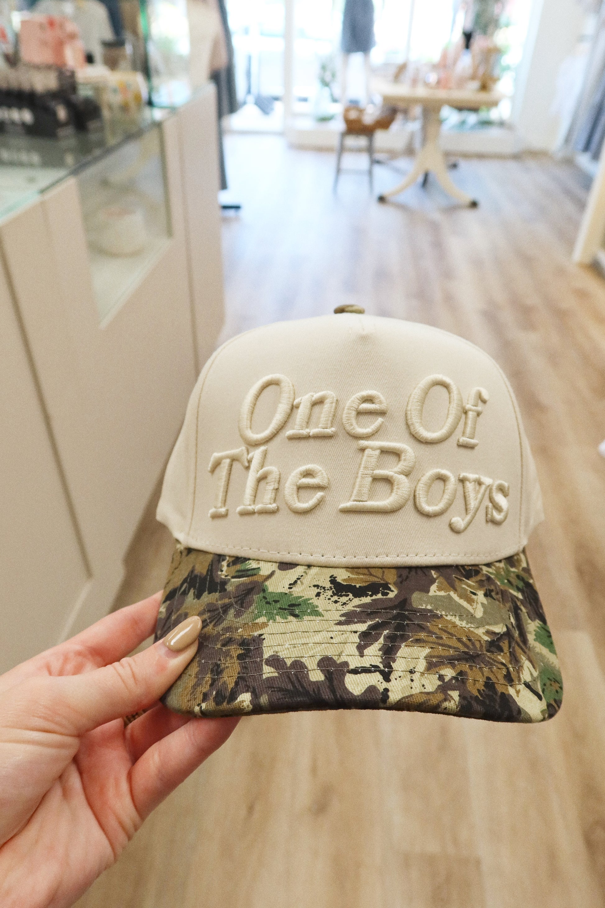Two-toned camo and natural snapback hat with 3D puff embroidery.
