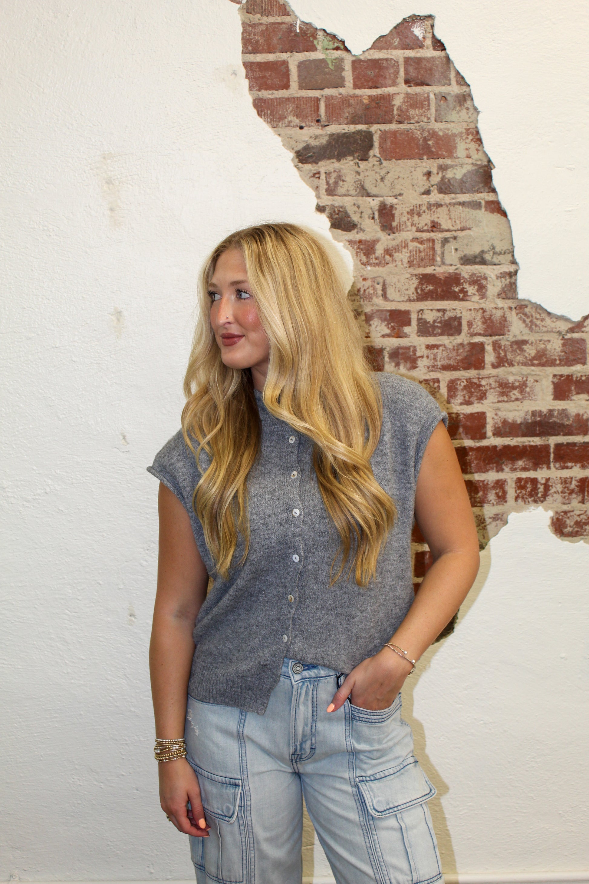 Heather grey soft sweater vest cardigan with rolled edge details.