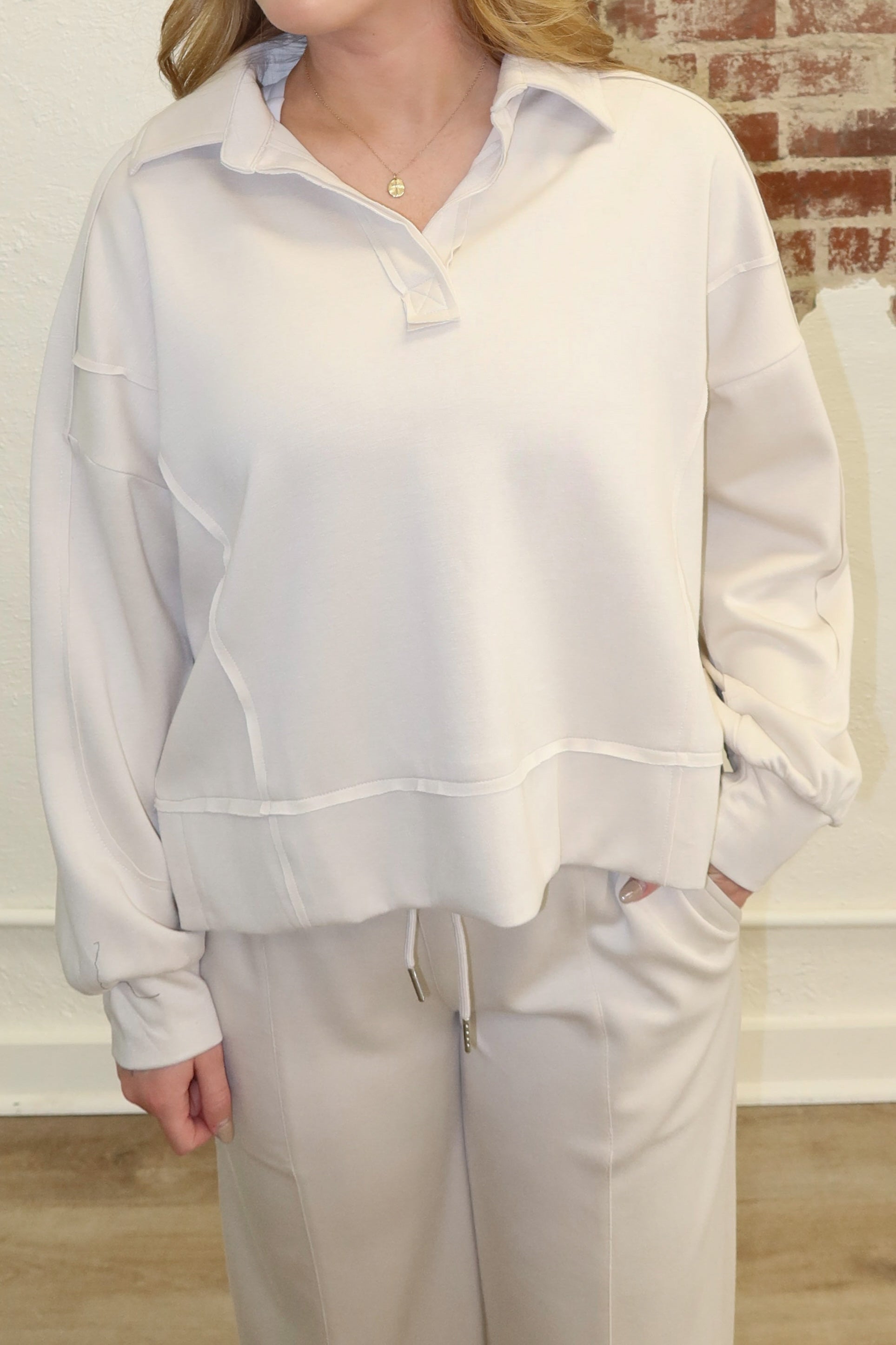 Ecru luxe knit pullover with polo detail & loose fit.