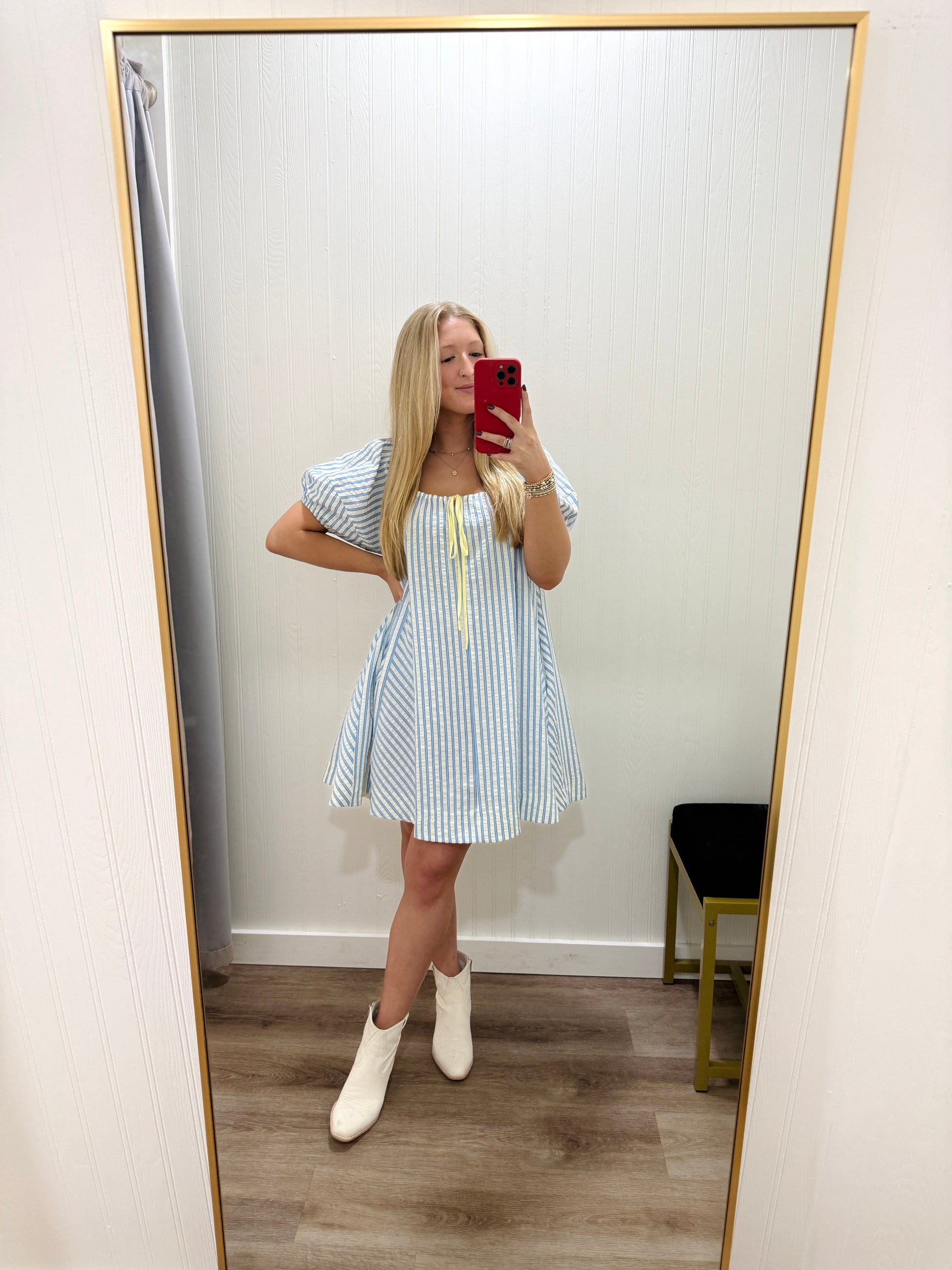 Blue striped seersucker mini dress with short puff sleeves & front tie detail.