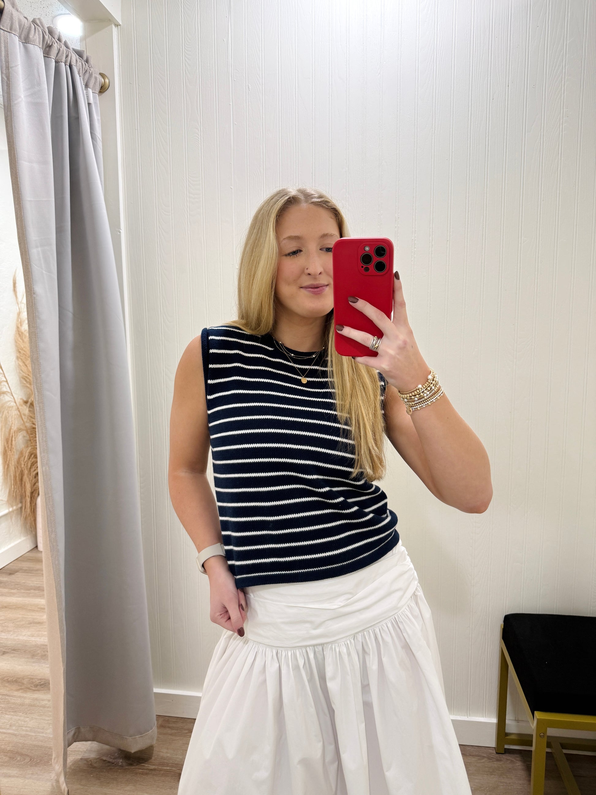The Paulson Top is a sleeveless knit tank and features a classic striped design. With its rolled neckline and sleeves, this relaxed-fit top is perfect for layering or wearing solo.