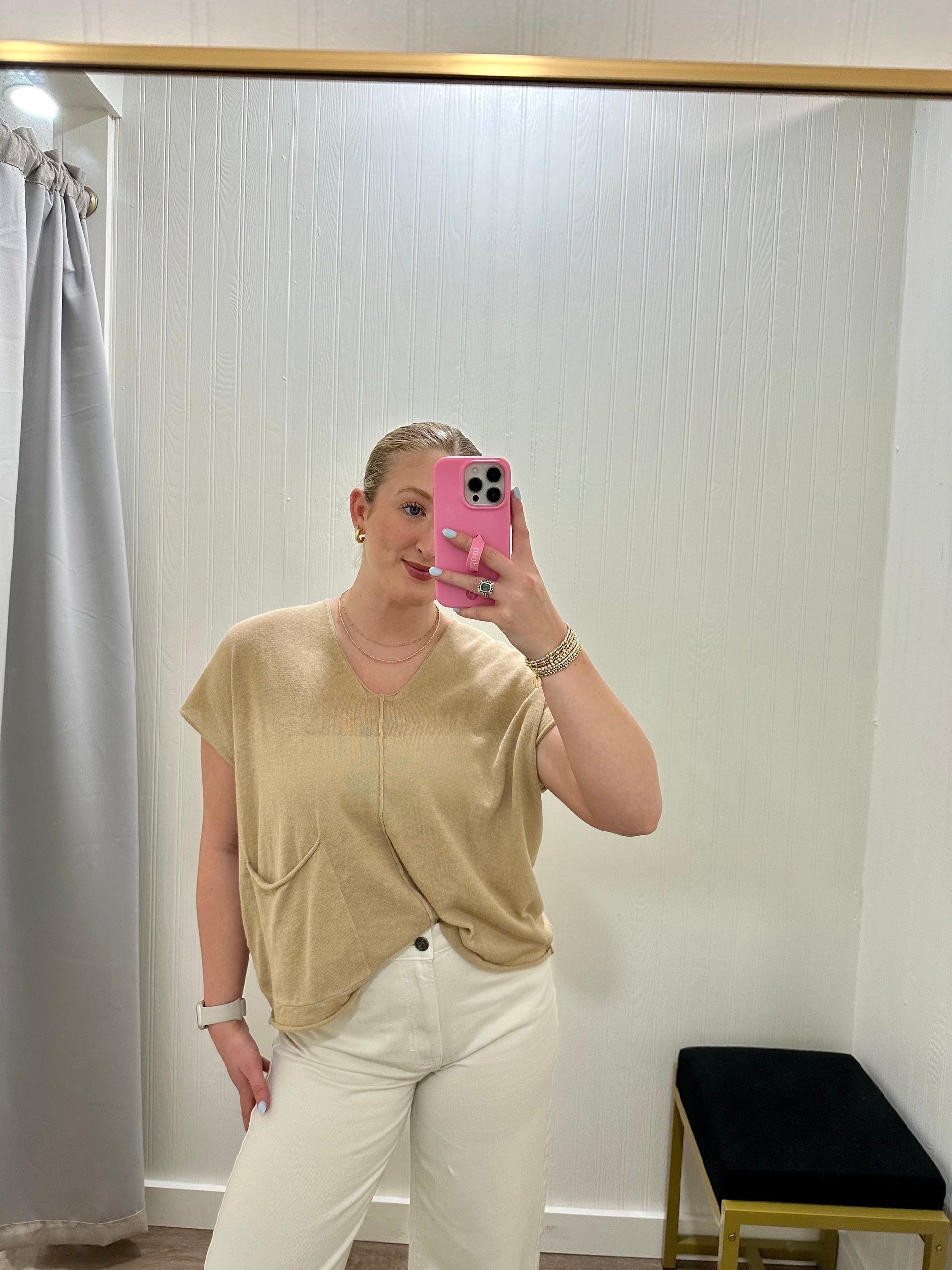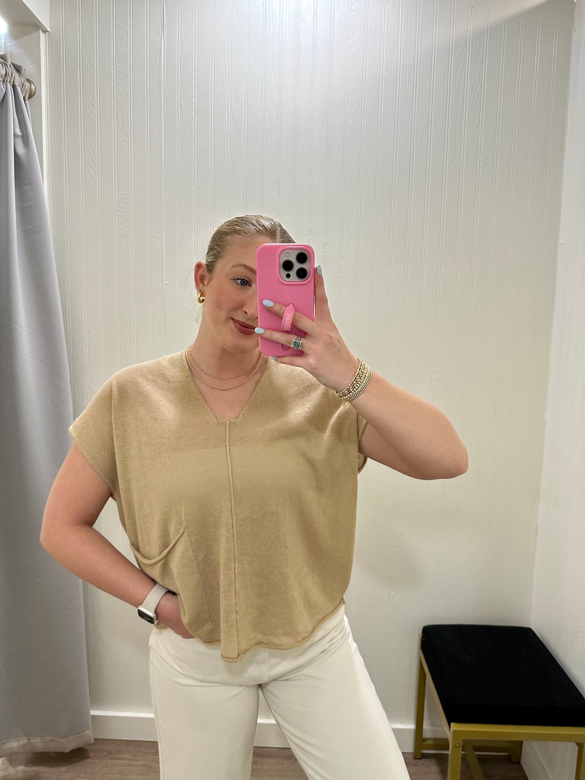 A relaxed fit top with short dolman sleeves and features a mid-line detail and a loose front pocket.