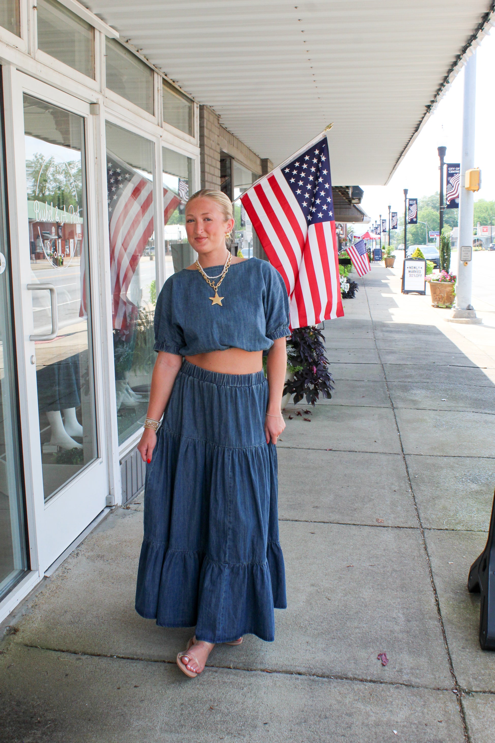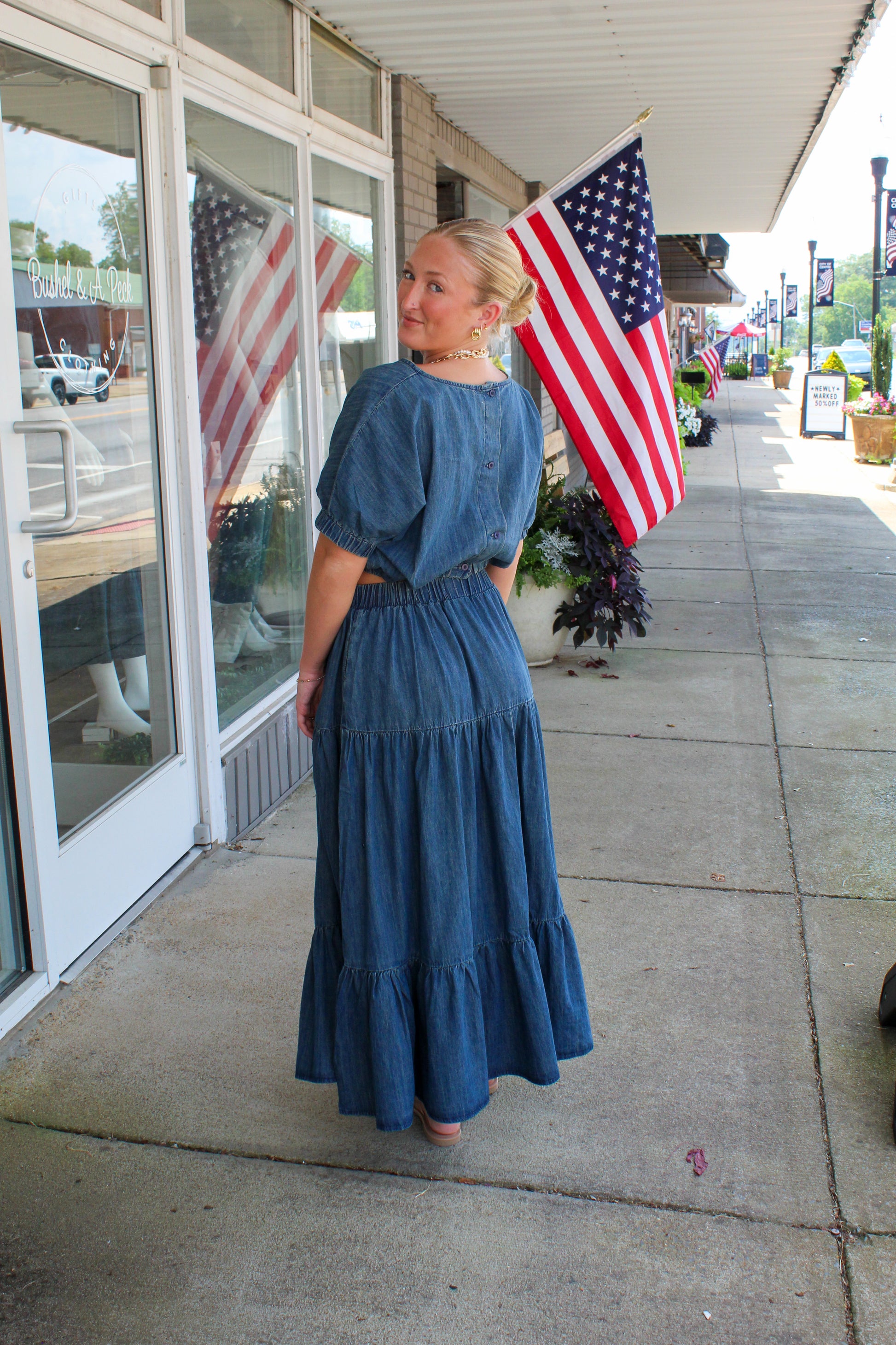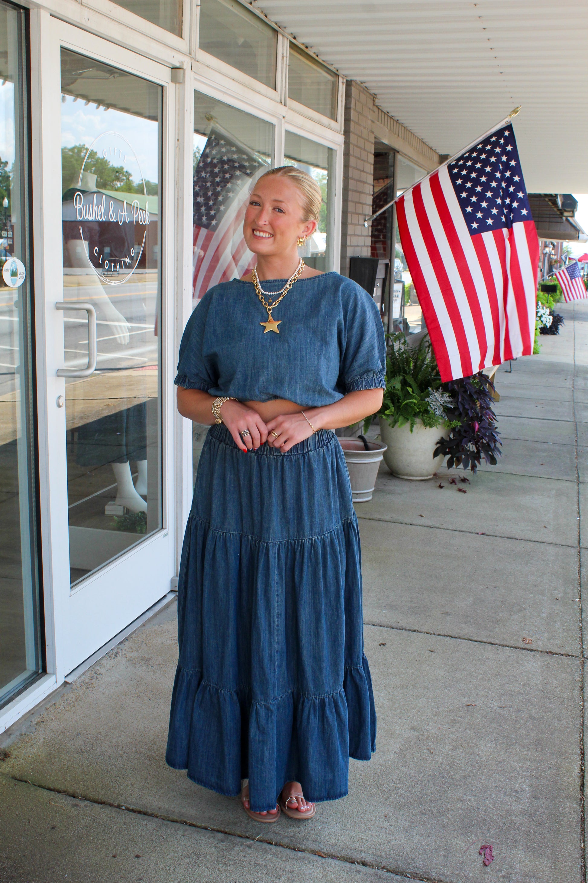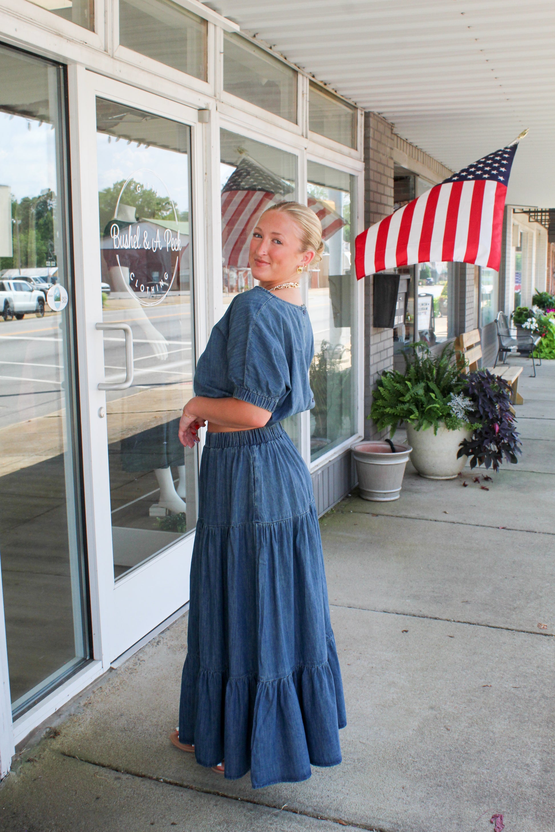 Indigo blue denim set- Short sleeve balloon top with elastic bottom & cropped detail & Tiered maxi skirt with elastic waistband.